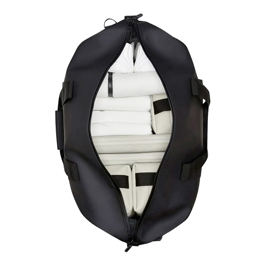 Hilo Weekend Bag is cut from Rains’ signature waterproof PU fabric, engineered for carrying strength, durability, and a smooth feel.