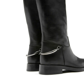 This knee-high boot channels classic equestrian style with a sleek, structured silhouette and polished black leather finish. A silver buckle detail at the ankle nods to heritage tack, while the low heel and clean lines keep the look contemporary. A versatile staple with timeless appeal.