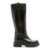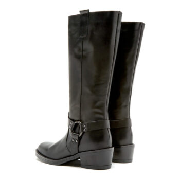 These knee-high boots feature a strap design with metal hardware that give a biker boot sensibility to an otherwise classic design. With a block heel and square toe, the double pull-tabs at the opening make these easy to slip on and go about your next urban adventure.